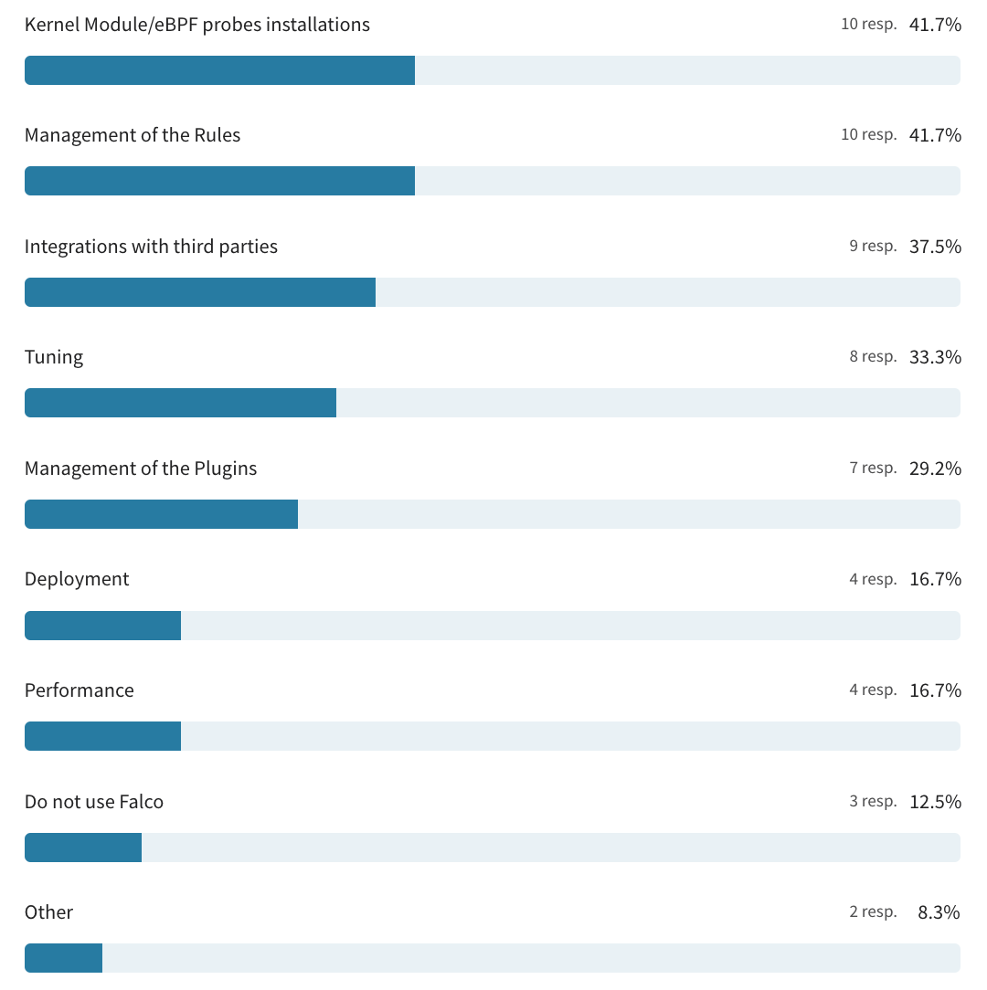 - The top two challenges faced by adopters of Falco were kernel module/eBPF probe installations (41.7%) and management of rules (41.7%).