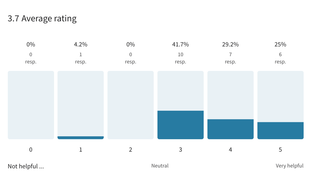 - Over 45% of respondents rated the community support as "Very helpful" (5), while 37.5% rated it as "Helpful" (4).