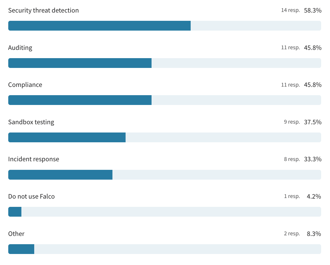 - Some respondents (12.5%) indicated that they do not use Falco, while others mentioned other challenges, such as integrating Falco security event logs with AWS CloudWatch and using AWS FireLens and Fluent Bit log event forwarding.