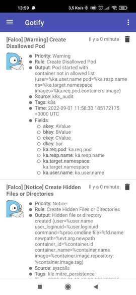 By using Gotify and the new dedicated output, you can now push Falco events to your Android phone.
