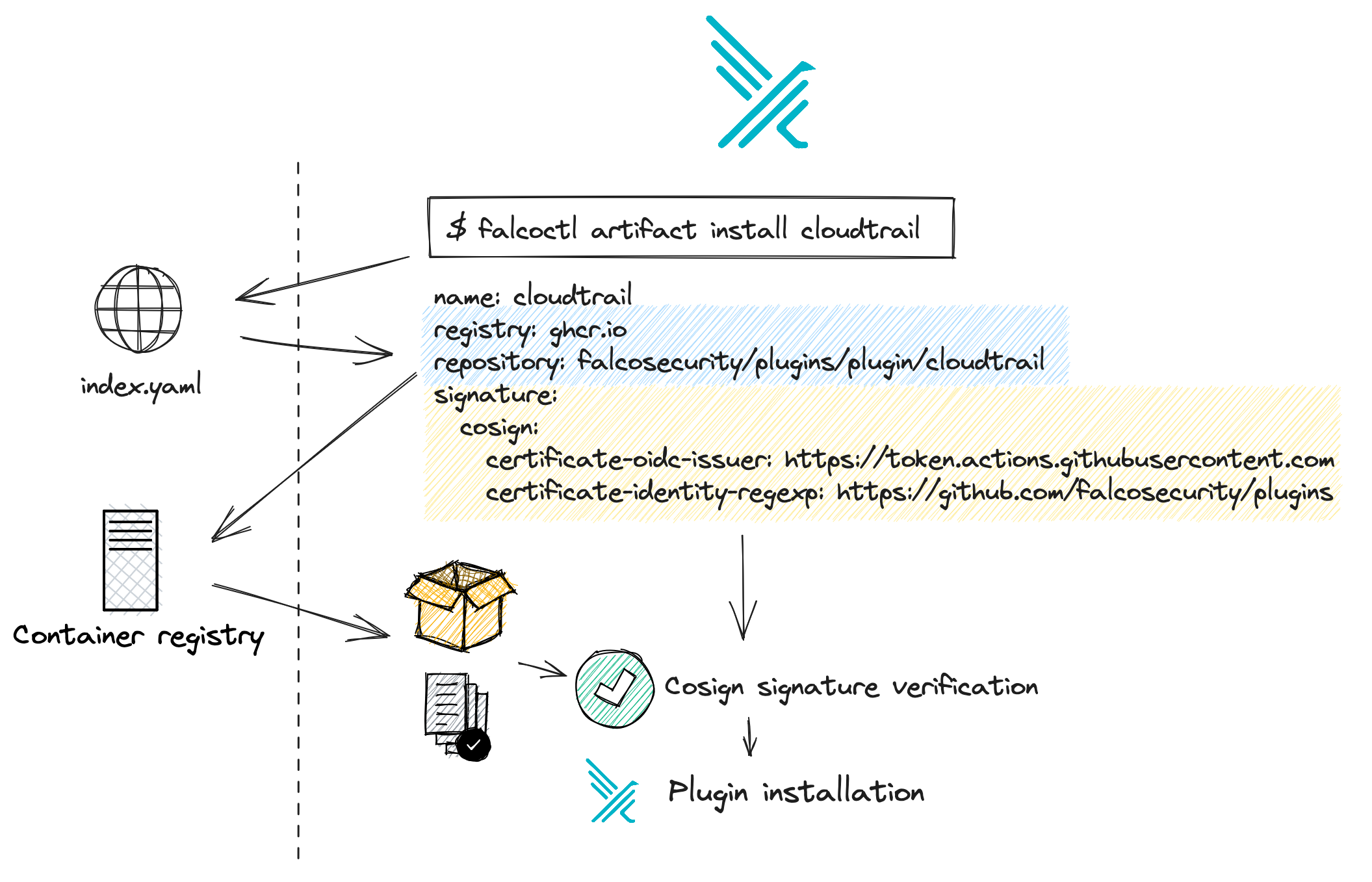 When designing this feature we decided not to change the existing usage of falcoctl. For example, you may already know that when you decide to install a new apt repository you need to also import its public key. When installing Falco artifacts with falcoctl, we can avoid this step and make verification transparent, thanks to keyless signing by trusting the Sigstore Fulcio CA. In the section above we introduced the concept of index files. Every time you use falcoctl, there is an index file that tells details about artifacts distributed by the Falco organization. For instance, the cloudtrail plugin has an entry with several pieces of metadata, including the OCI artifact coordinates: ghcr.io/falcosecurity/plugins/plugin/cloudtrail. Of course, anyone can distribute and install their own index file for their plugins and rules.